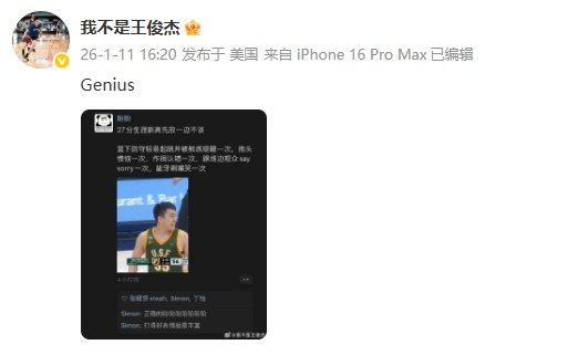 赛后,王俊杰发博转发打趣调侃自己的言论,并配文道:“Genius(天才)。”
